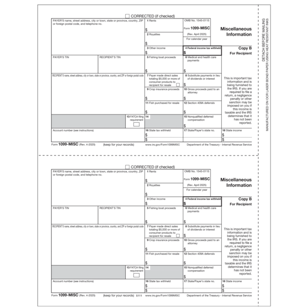 5111 1099-MISC Recipient Copy B - 50 Pack SKU: 5111 $19.72 Prior Job# Special Instructions Logo & Options : $0 - Color Logo $68 - Black Logo $90 - Color Logo No Charge - 1 Color Logo No Charge - Black Logo Quantity -+ Please select options before adding to cart Add to Cart Add to Cart